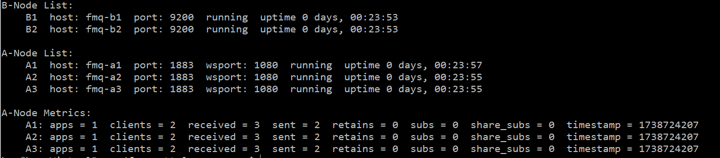 $ sudo docker exec fmq-log /freemqttd/cluster_view屏幕会出现如下显示